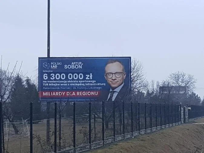 Oprócz uśmiechniętej twarzy polityka na bilbordach jest kwota dotacji i informacja, na co została przeznaczona. Do tego symbol Polskiego Ładu i hasło "Miliardy dla regionu".