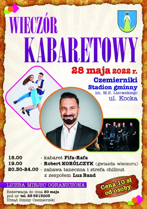 Wójt informuje : - Po 20 maja bilety nie będą już sprzedawane ani w dniu imprezy. Cena jest symboliczna więc zapraszamy wszystkich na płytę stadionu. Artyści będą widoczni i słyszalni wyłącznie z płyty stadionu.