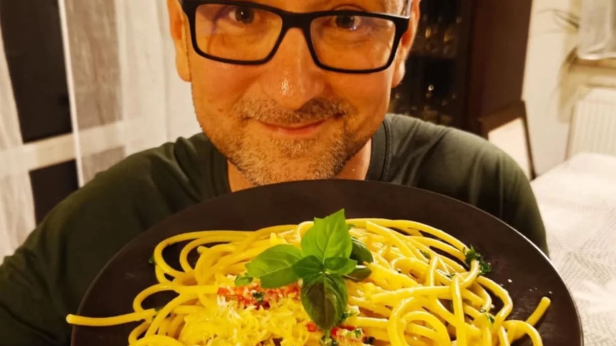Najpierw kilka prostych zasad dotyczących gotowania spaghetti. Wody potrzebujemy jeden litr na każde 100 gram suchego makaronu. W gruncie rzeczy może być dowolny, ale najczęściej jest to spaghetti, ja najbardziej lubię bucatini - trochę grubsze od spaghetti z dziurką w środku. Solimy wodę dopiero, kiedy zacznie wrzeć. Makaron ma być al dente, czyli "na ząb" - nie może, w żadnym wypadku, być miękki i rozgotowany, ma stawiać lekki opór. W związku z tym wyjmujemy go z garnka chwilę wcześniej niż się taki stanie - do właściwego stanu dojdzie na patelni. Zupełnie odruchowe musi być odebranie pod koniec gotowania kubka wody z gotowania makaronu - będzie bazą naszego sosu.