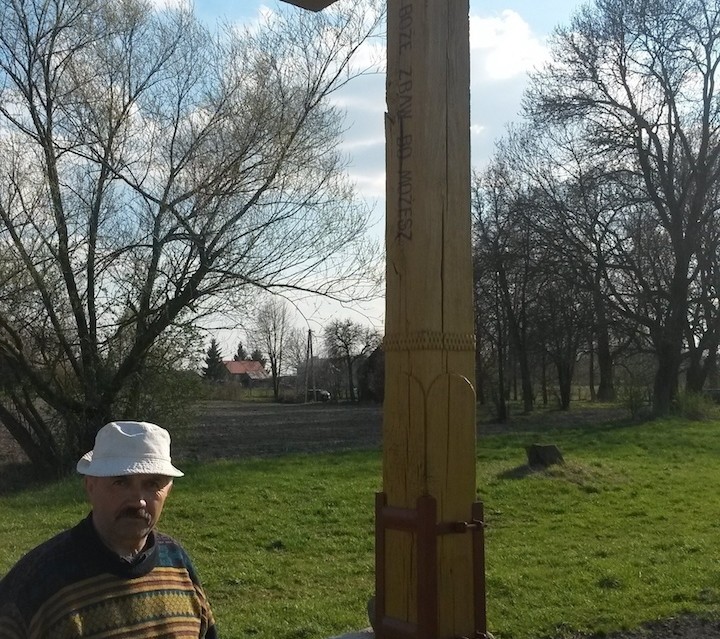 - Jeżeli my zapomnimy o takich krzyżach i o tym, co one symbolizują, Bóg zapomni o nas - tłumaczy swoją inicjatywę Szaniawski. - Jako dziecko przechodziłem tędy mnóstwo razy, ale nawet kiedy starsi coś chcieli opowiadać, to ja nie bardzo słuchałem. Dzisiaj żałuję. A przecież on miał i ma znaczenie. Dzisiaj wydaje się, że stoi trochę na uboczu, tutaj kończy się już nawet asfalt, ale kiedyś wyznaczał początek wsi. Z drugiej strony, tam gdzie dziś na rozstajach stoi pomnik Jana Pawła II, był drugi, cała wioska mieściła się między nimi... Tamten rosochaty, zawalił się jakiś czas temu, ale już kolega rzeźbi nowy, lada chwila będzie go można postawić.