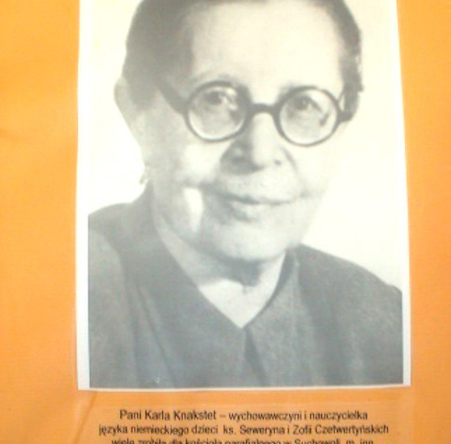 Jedną z najciekawszych postaci, jakie można było spotkać w pałacu Czetwertyńskich w Suchowoli, była Karolina Knaksztedt, pełniąca tam funkcje bony i nauczycielki języka niemieckiego dzieci Zofii i Seweryna Czetwertyńskich. W wolnym czasie uczyła miejscowe dzieci religii i przygotowywała je do Pierwszej Komunii. Przez Czetwertyńskich była traktowana jak członek rodziny. Przyjechała tu 31 października 1918 roku i pozostała jak długo było tylko to możliwe: kiedy powierzone jej pieczy dzieci pojechały do szkół, ona pozostała w gościnnym pałacu. Kiedy we wrześniu do Suchowoli wkroczyli Niemcy, byli bardzo oburzeni lojalną postawą swojej rodaczki (Karolina przez cały czas posiadała niemieckie obywatelstwo!), która chciała zostać z zaprzyjaźnioną rodziną i mieszkańcami wsi. Przymusowo została wysiedlona do Rzeszy. Kiedy zakończyła się wojna Karla Knaksztedt odnalazła dawnych chlebodawców, została przez nich chętnie przyjęta do domu i do śmierci zamieszkiwała razem z nimi.