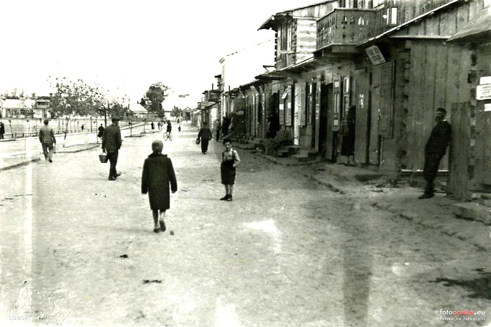 Duży biały budynek po prawej ręce to prawdopodobnie dzisiejsza poczta, w dalekim planie nieistniejący już dworek.