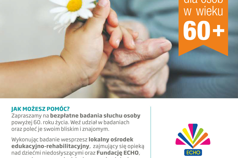 W ramach Kampanii zapraszamy na bezpłatne badania słuchu osoby powyżej 60 roku życia. Zachęcamy do brania udziału w badaniach i przekazywania informacji swoim bliskim, ponieważ wykonując badanie słuchu wspieramy lokalne ośrodki edukacyjno-rehabilitacyjne, które zajmują się opieką nad dziećmi niedosłyszącymi oraz Fundację Echo, która pomaga w rozwoju dzieciom z wadą słuchu.